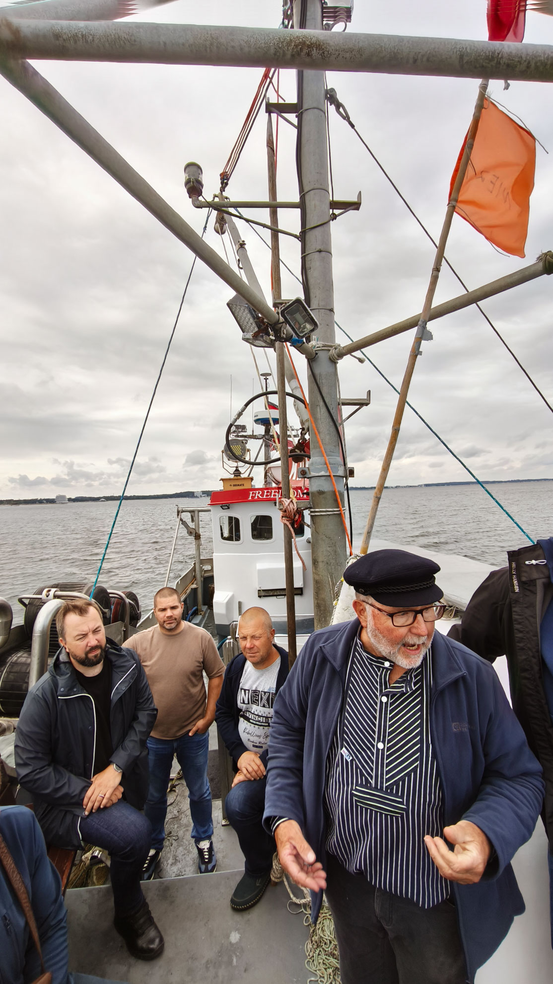 Oldhofa kungs aicināja mūsu zvejniekus izbraucienā ar zvejas kuģi pa Timmendorfas līci, kura laikā tika izraudzīti nelieli murdi. Tajos lielā daudzumā bija cimdiņkrabji, arī garneles, zutis, plekstes un pat viens lucītis un jūraszvaigzne. Kuģis ir pielāgots tūristu vadāšanai, tas nozīmē – pietiekami liels skaits soliņu, kur braucējiem apsēsties, kā arī īpaša kaste ar ūdeni uz klāja, kurā tiek ievietotas nozvejotās zivis ar kurām mēdz iepazīstināt brauciena dalībniekus.