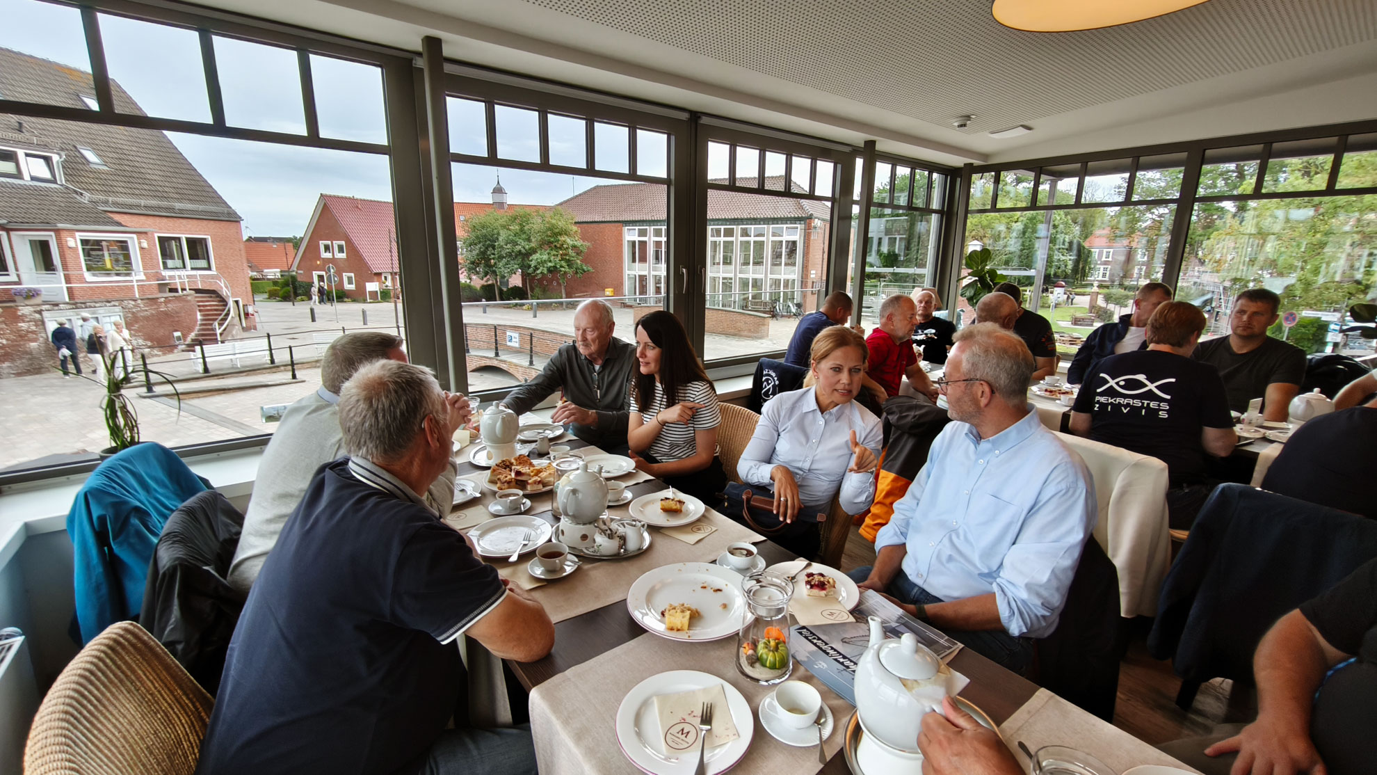 Pēc brauciena ar kuģi pilsētas birģermeistars Petersa kungs aicināja mūsu zvejniekus uz launagu – tasi Austrumfrīzijas tējas un kūkām. Launaga laikā gan birģermeistars, gan pieaicinātais pilsētas ekonomikas un tūrisma aģentūras pārstāvis iepazīstināja ar tūrisma stratēģiju, kas pamatā balstās uz reģionam vērtībām – pirmkārt Vatu jūru un zvejniecību. Petersa kungs uzsvēra, ka pilsēta ceļotājus piesaista ar sakoptību un tīrību un tikai šai mazajai pilsētiņai raksturīgo mazo ostiņu, kurā bāzējas nelieli zvejas kuģi.